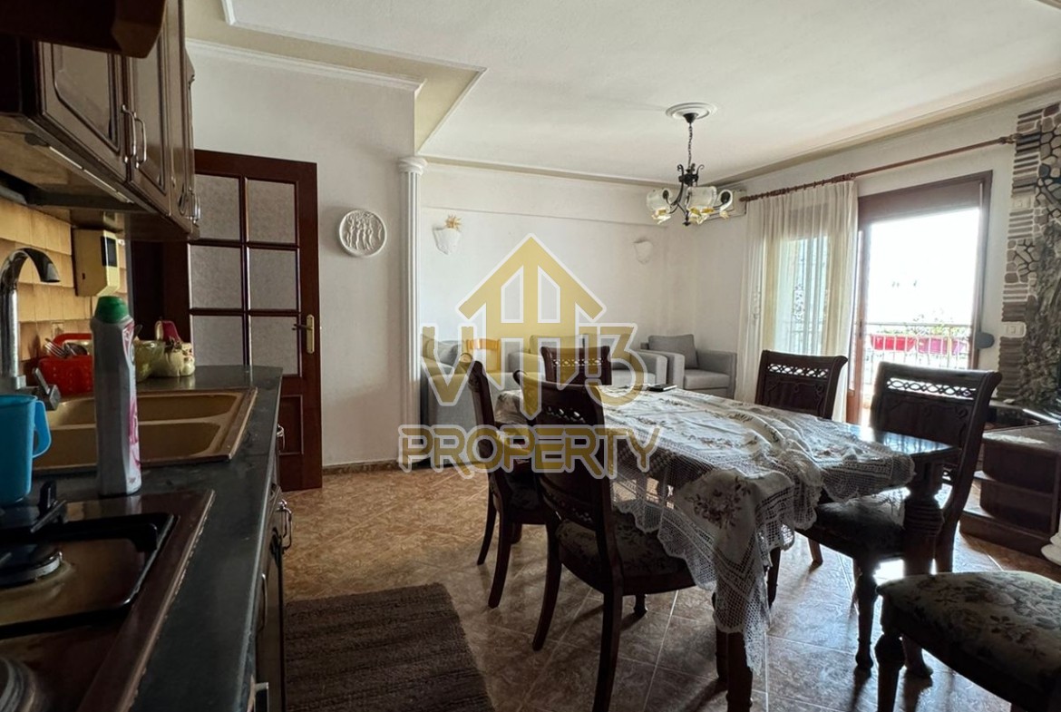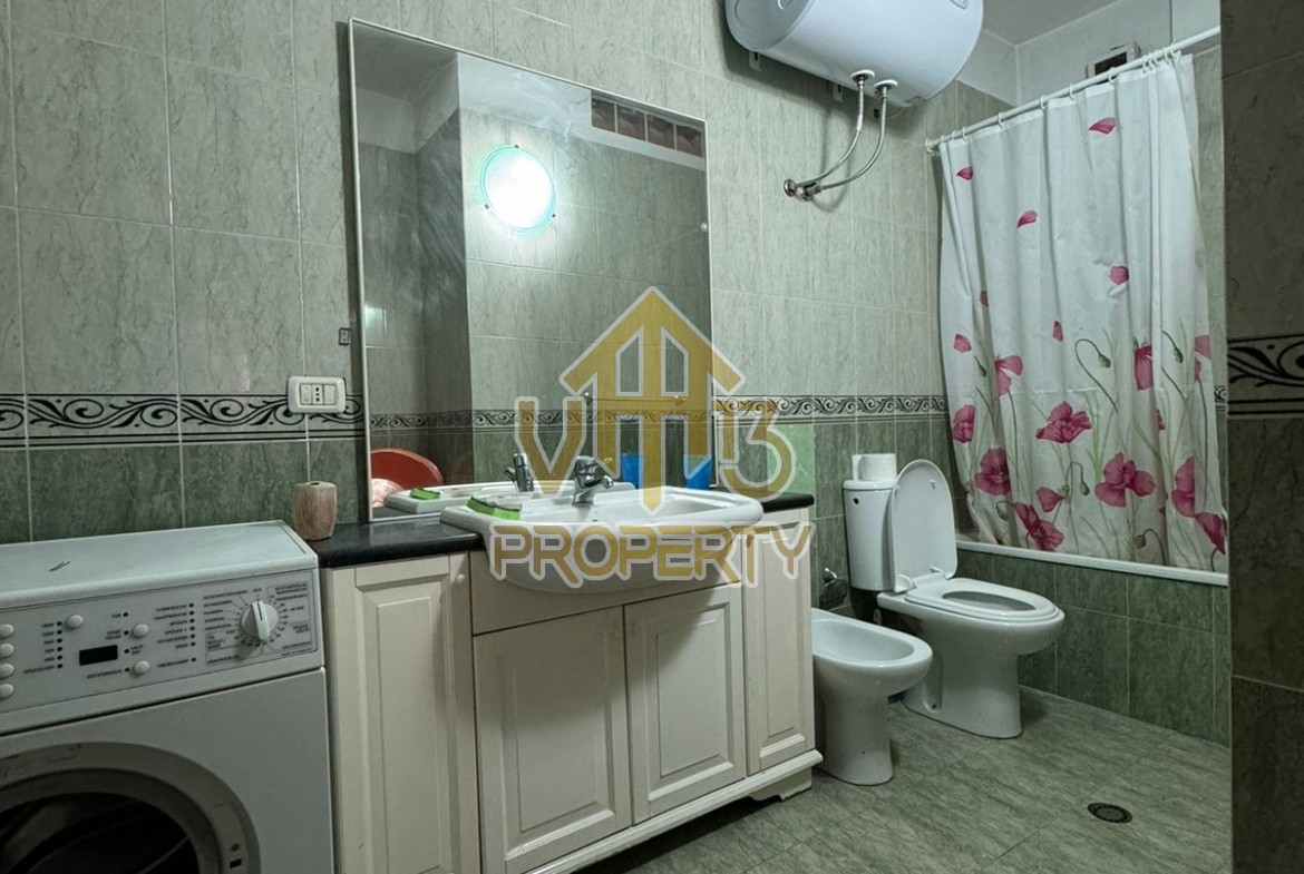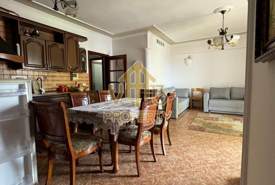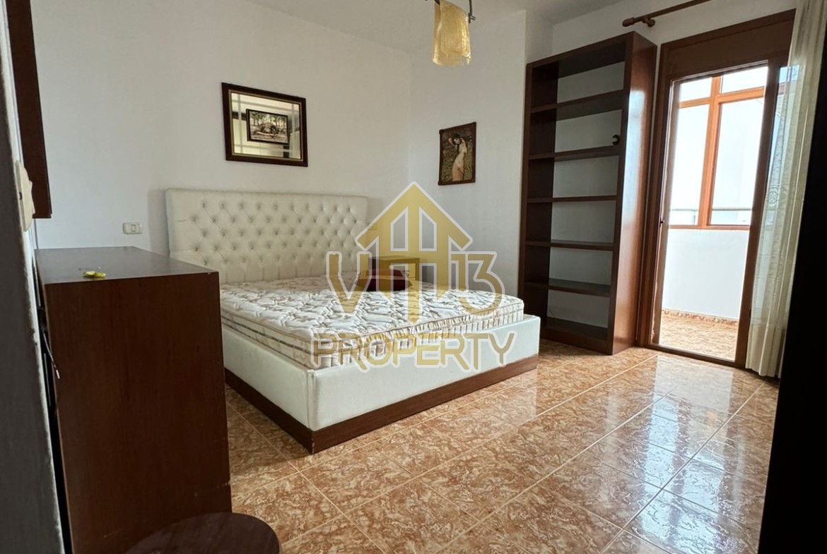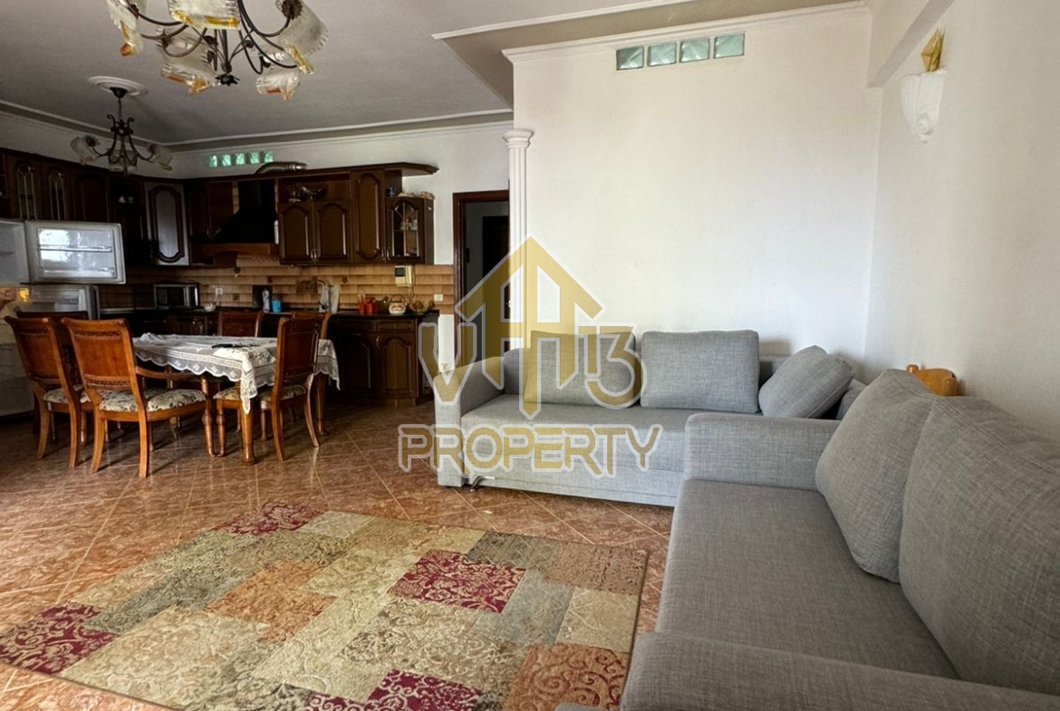 Apartamenti ndodhet prane Markates. I organizuar ne nje dhome ndenje se bashku me kendin e kuzines, dy dhoma gjumi, dy tualete dhe dy ballkone . Apartamenti ndodhet ne katin e shtate te nje pallati te ri, te pajisur me ashensor dhe administrim te rregullt. Siperfaqja totale e apartamentit eshte 110 m2. Apartamenti eshte i mobiluar me te gjitha kushtet e nevojshme. Per nje vizite ne prone apo ne prona te ngjashme na kontaktoni.