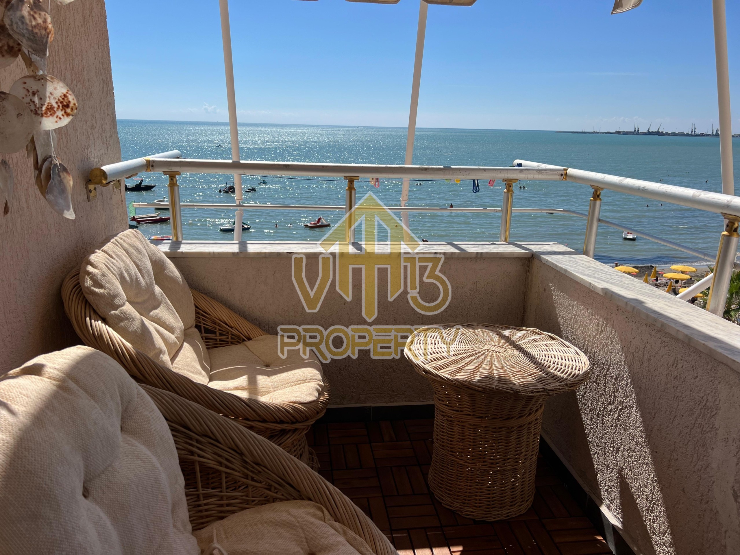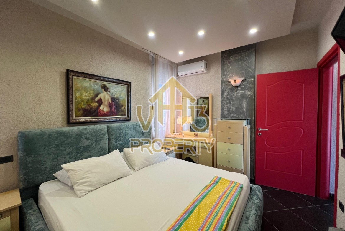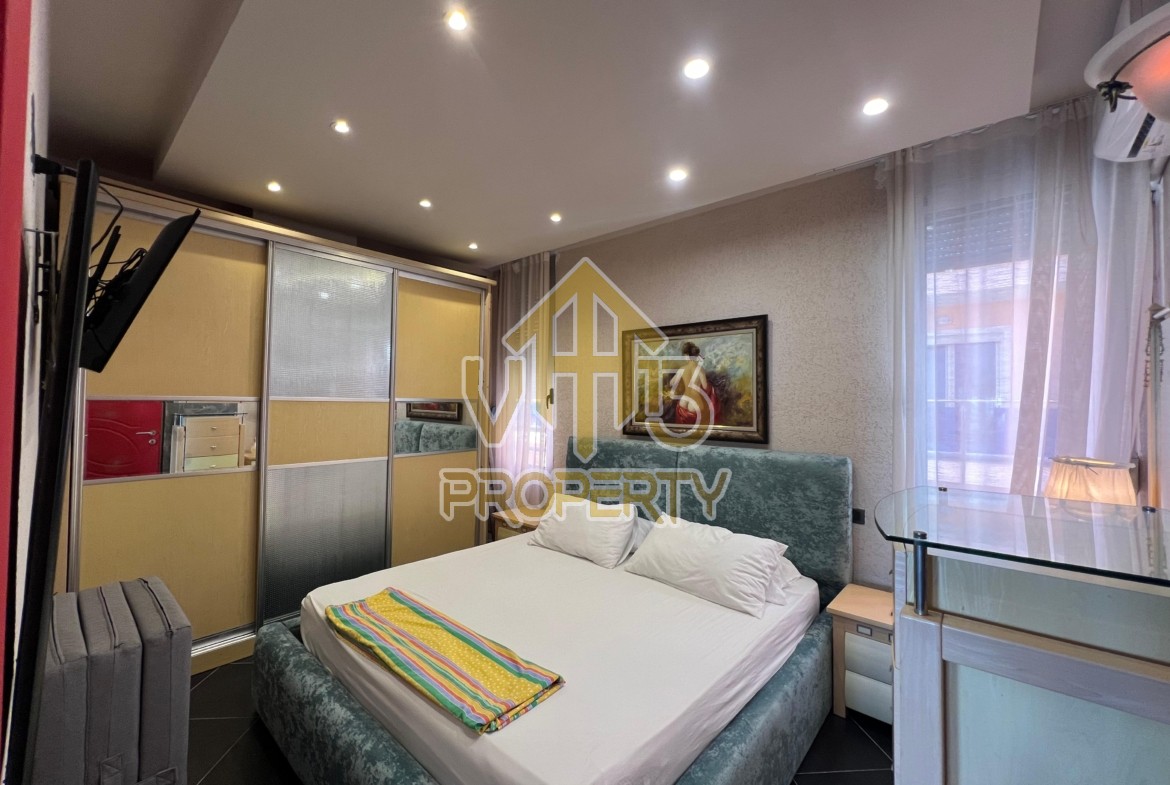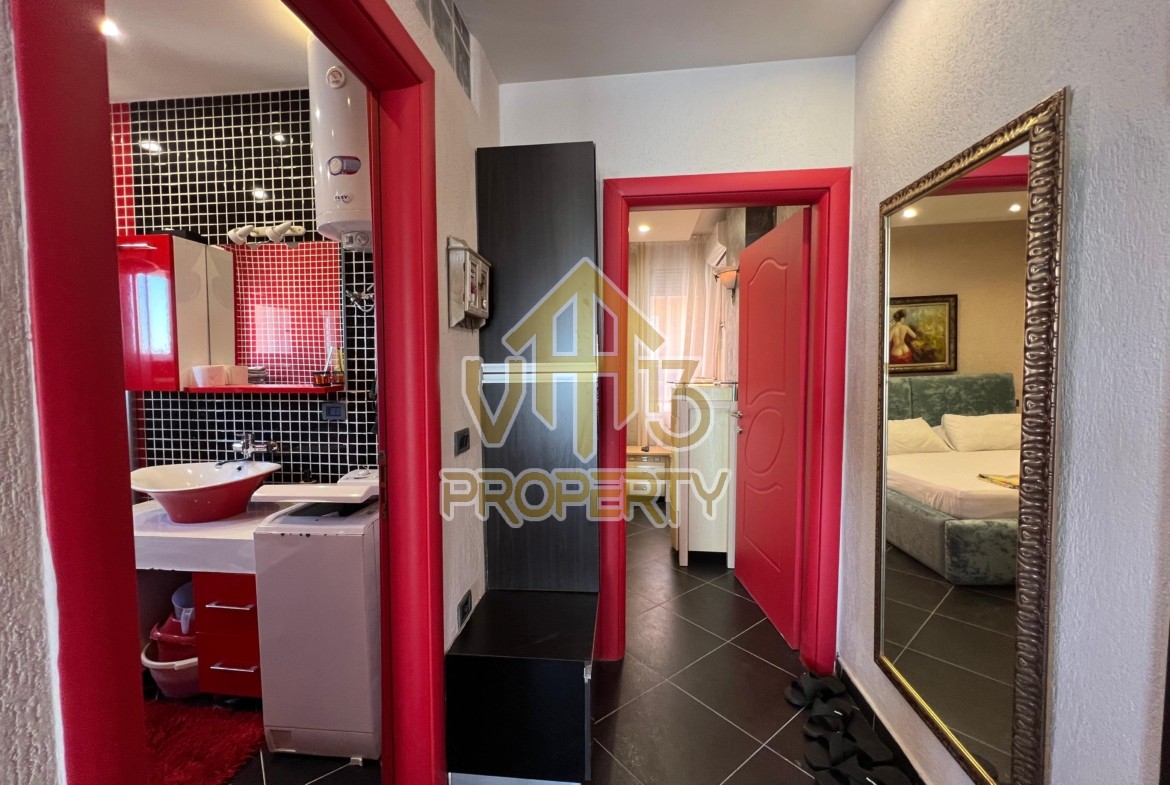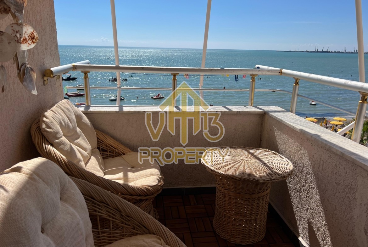 Apartamenti ndodhet ne nje nga zonat me te bukura te bregdetit ne zonen e Plazhit. I organizuar ne nje dhome ndenje se bashku me kendin e kuzines, nje dhome gjumi, nje tualet dhe nje ballkon me pamje ballore nga deti ne vije te pare. Apartamenti eshte totalisht i arreduar deri ne detaje te nje stili modern, sistem ngrohje , sistm ndricimi, tavane te varura, sistem kondicionimi. Ndodhet ne katin e katert te nje pallati te ri te pajisur me ashensor dhe administrim te rregullt. Siperfaqja e apartamentit eshte 66 m2. Disponon dokumentacion te rregullt hipotekor. Per nje shoqerim ne prone ju ftojme te na kontaktoni