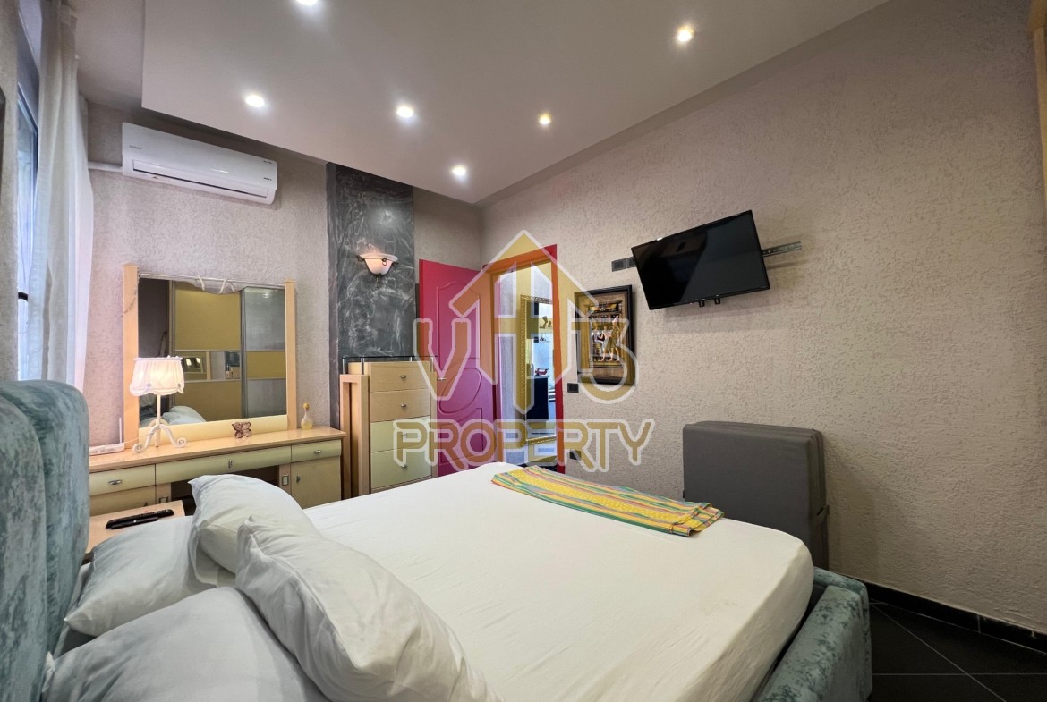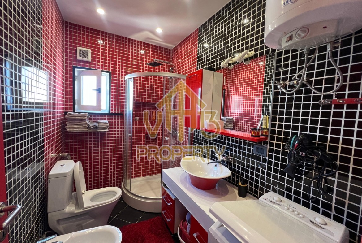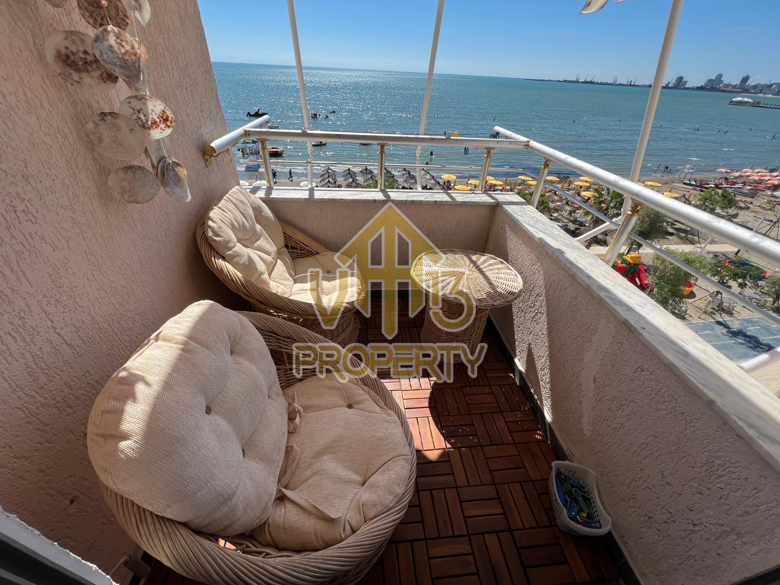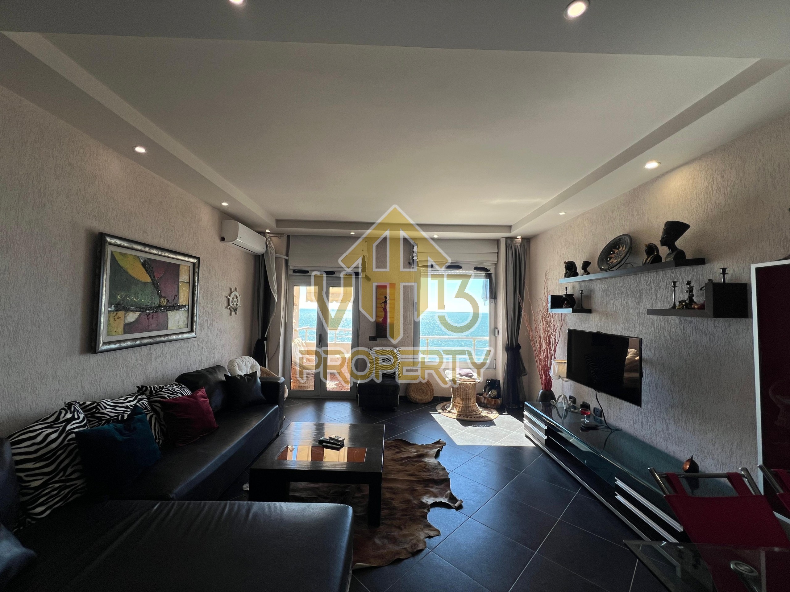 Apartamenti ndodhet ne nje nga zonat me te bukura te bregdetit ne zonen e Plazhit. I organizuar ne nje dhome ndenje se bashku me kendin e kuzines, nje dhome gjumi, nje tualet dhe nje ballkon me pamje ballore nga deti ne vije te pare. Apartamenti eshte totalisht i arreduar deri ne detaje te nje stili modern, sistem ngrohje , sistm ndricimi, tavane te varura, sistem kondicionimi. Ndodhet ne katin e katert te nje pallati te ri te pajisur me ashensor dhe administrim te rregullt. Siperfaqja e apartamentit eshte 66 m2. Disponon dokumentacion te rregullt hipotekor. Per nje shoqerim ne prone ju ftojme te na kontaktoni