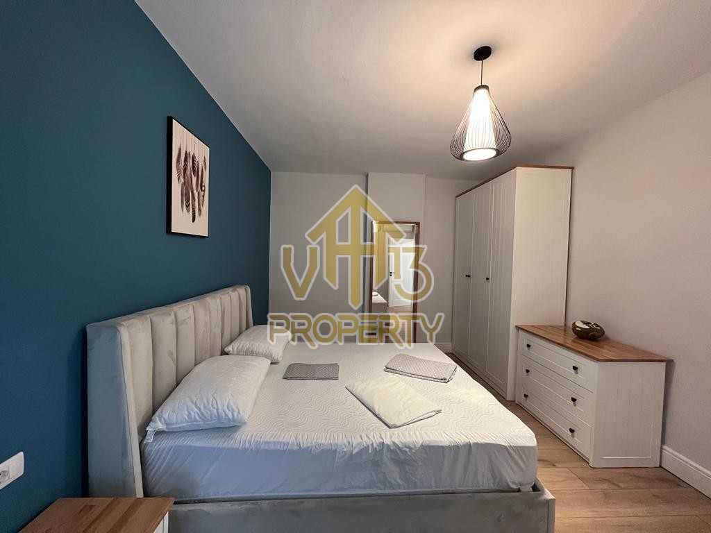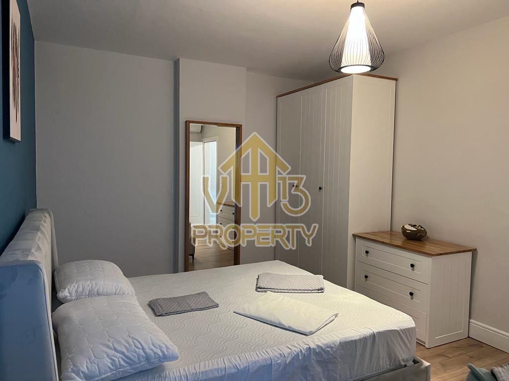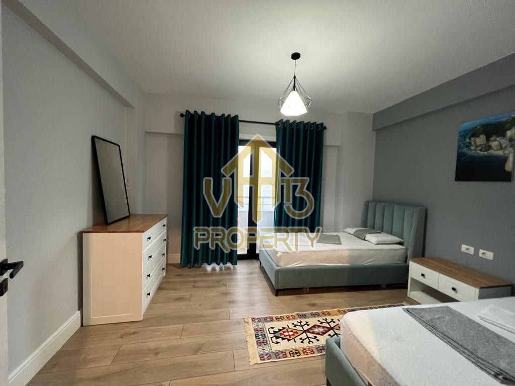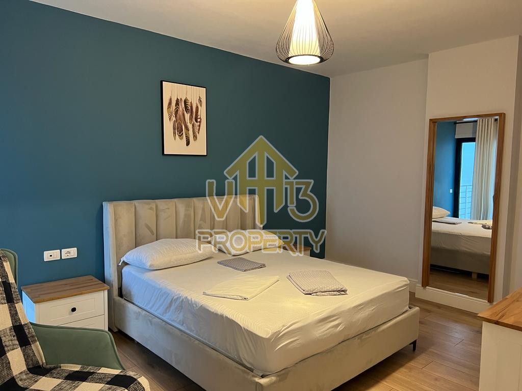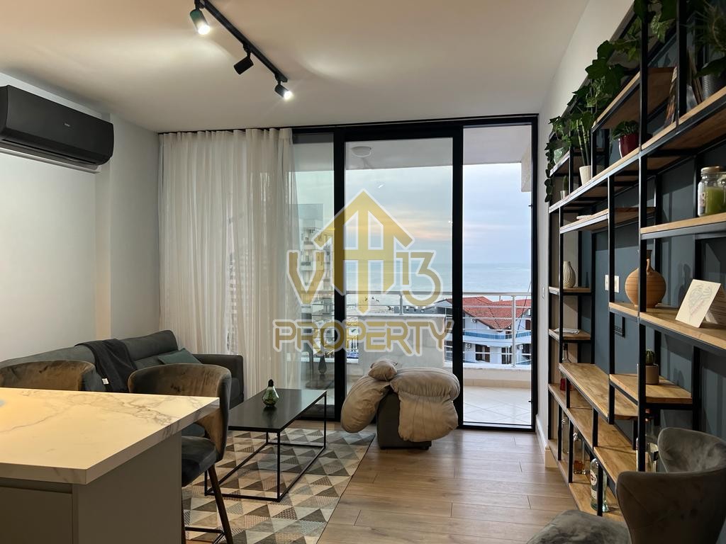 Apartamenti ndodhet ne nje nga zonat me relaksuese dhe te bukura te qytetit. Ka nje siperfaqe totale prej 100 m2 dhe siperfaqe e brendshme prej 90 m2. Eshte i organizuar ne nje koridor i cili ben shperndarjen ne dhomen e ndenjes se bashku me kendin e kuzhines, dy dhoma gjumi, nje tualet dhe nje ballkon me pamje ballore me detin. Apartamenti eshte i arreduar totalisht i nje stili modern deri ne detajet me te vogla. Zona ne te cilen ndodhet ofron akses ne te gjitha fasilitetet e nevojshme, ideale per nje jetese te qete dhe komode. Per nje vizite ne prone apo ne prona te ngjashme na kontaktoni.