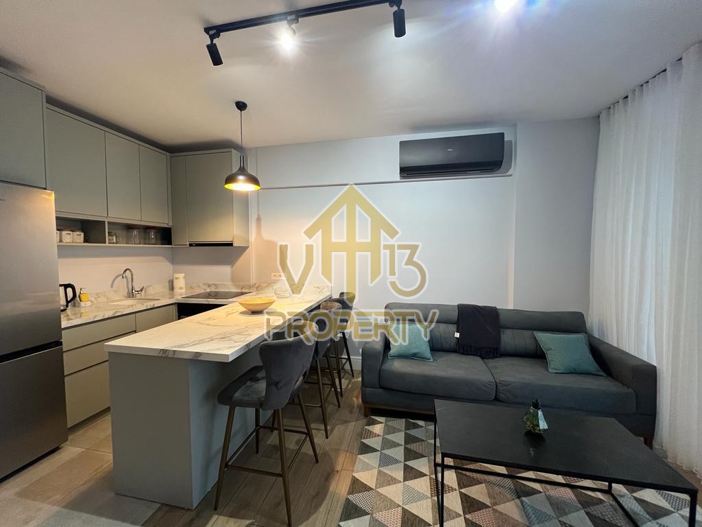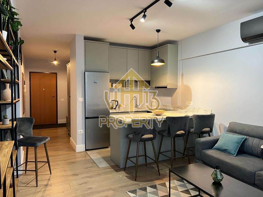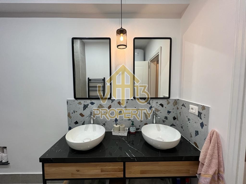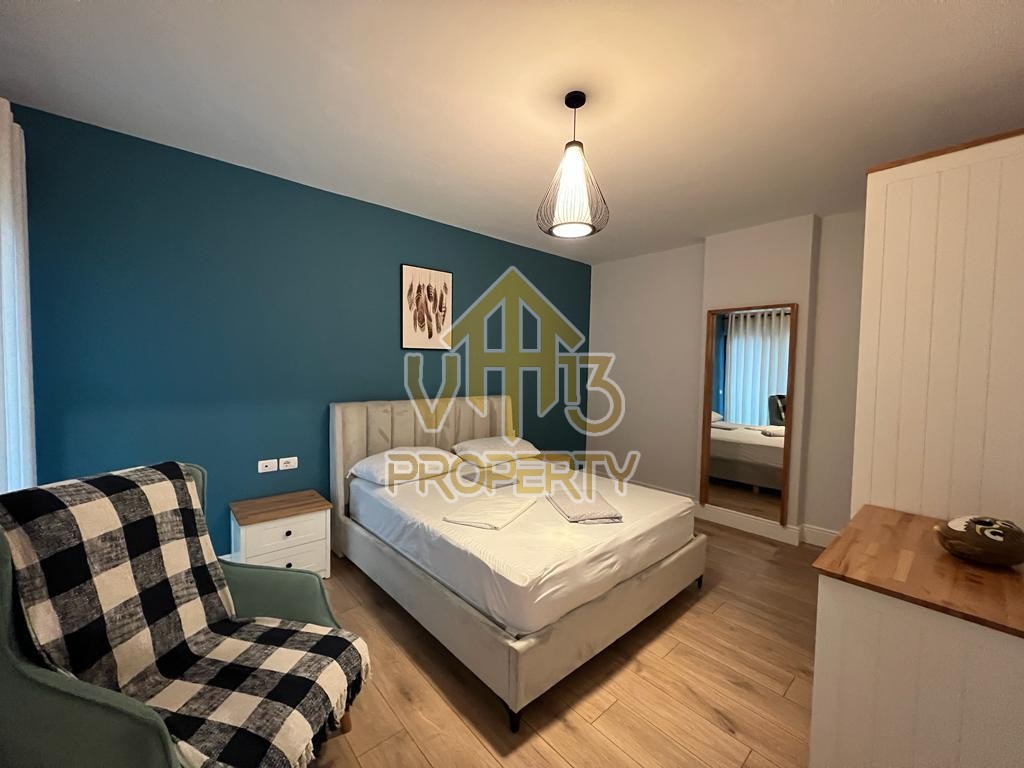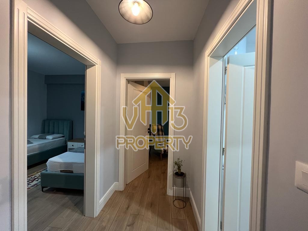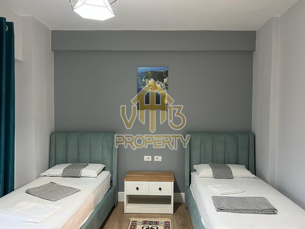 Apartamenti ndodhet ne nje nga zonat me relaksuese dhe te bukura te qytetit. Ka nje siperfaqe totale prej 100 m2 dhe siperfaqe e brendshme prej 90 m2. Eshte i organizuar ne nje koridor i cili ben shperndarjen ne dhomen e ndenjes se bashku me kendin e kuzhines, dy dhoma gjumi, nje tualet dhe nje ballkon me pamje ballore me detin. Apartamenti eshte i arreduar totalisht i nje stili modern deri ne detajet me te vogla. Zona ne te cilen ndodhet ofron akses ne te gjitha fasilitetet e nevojshme, ideale per nje jetese te qete dhe komode. Per nje vizite ne prone apo ne prona te ngjashme na kontaktoni.
