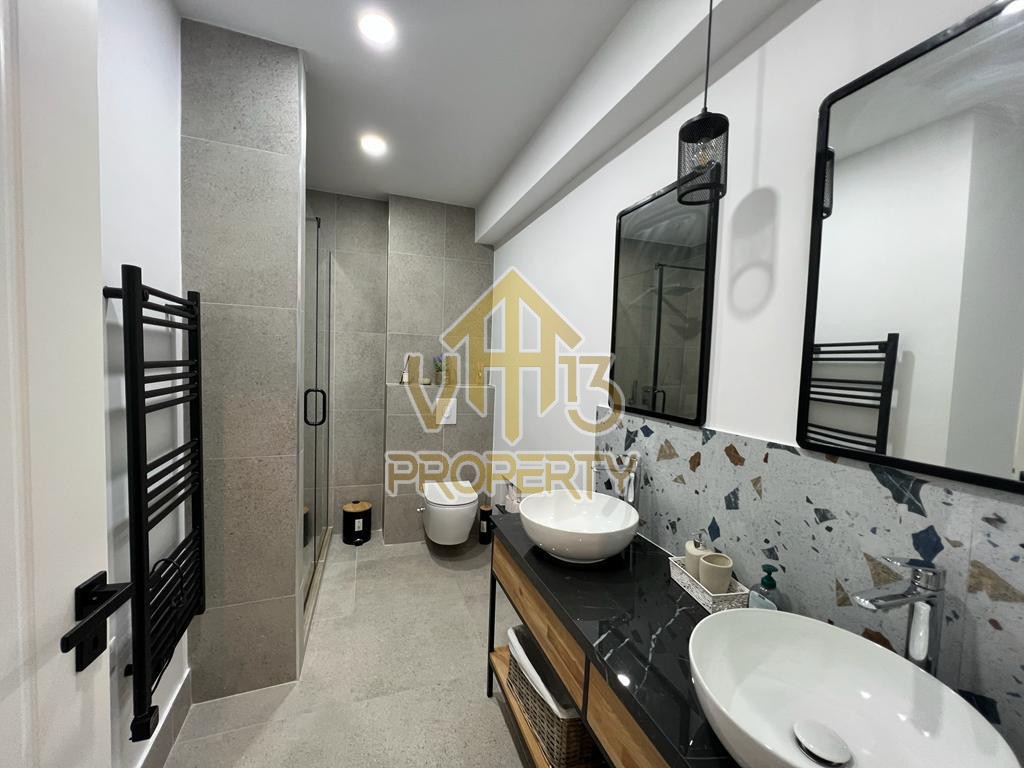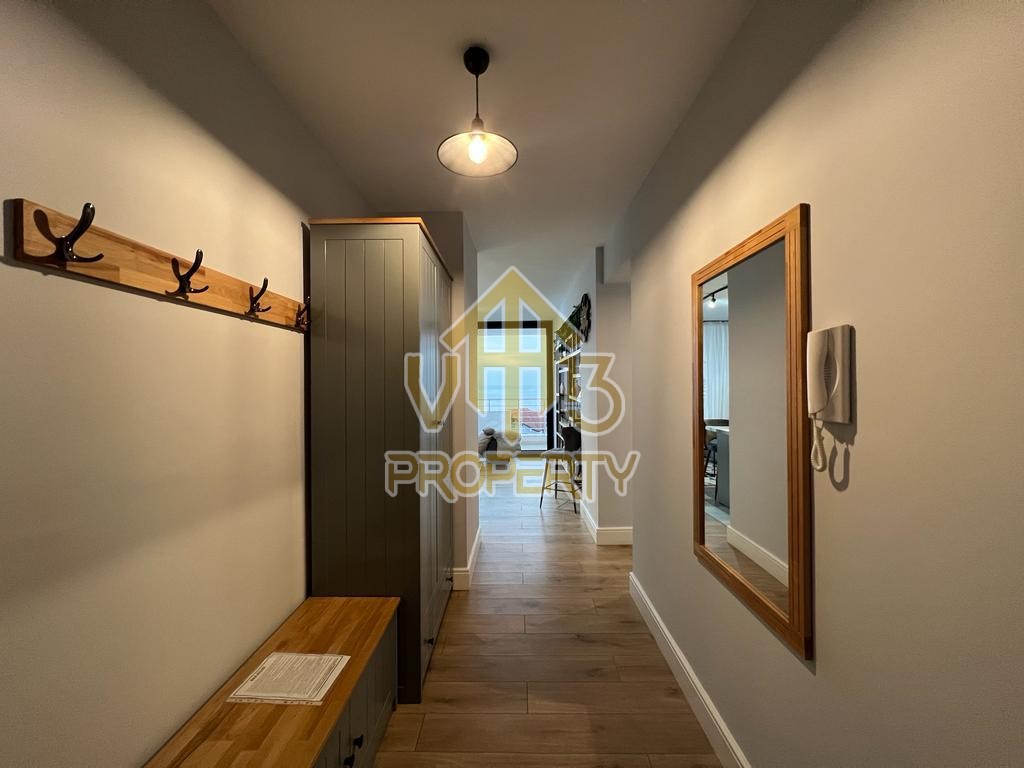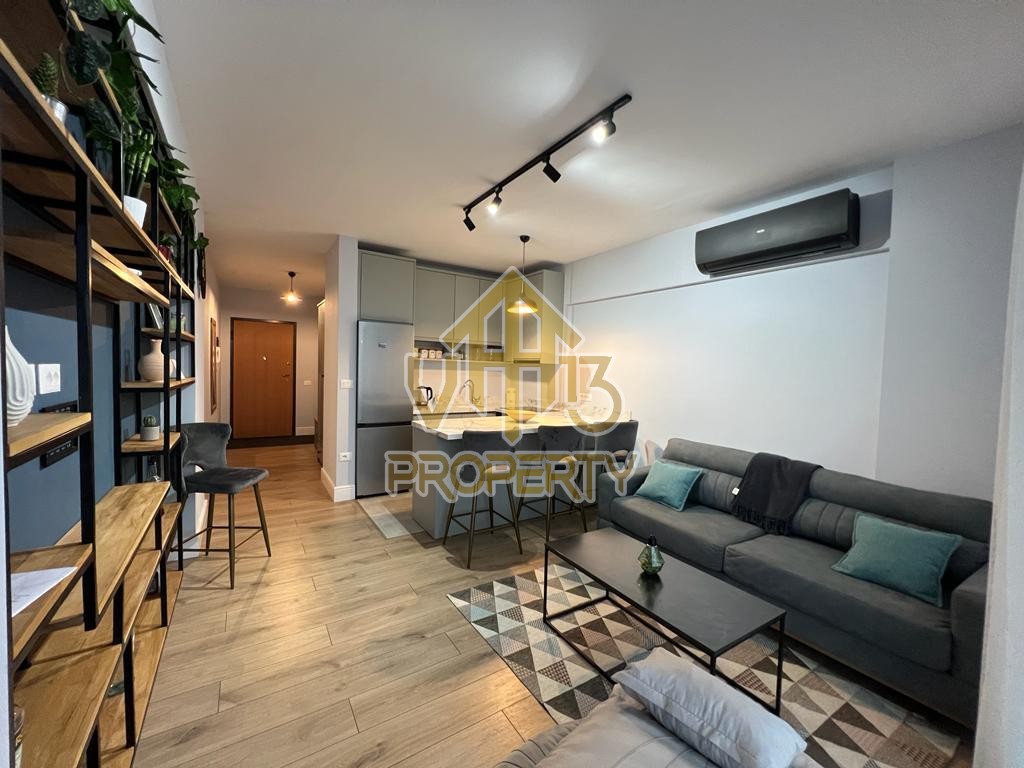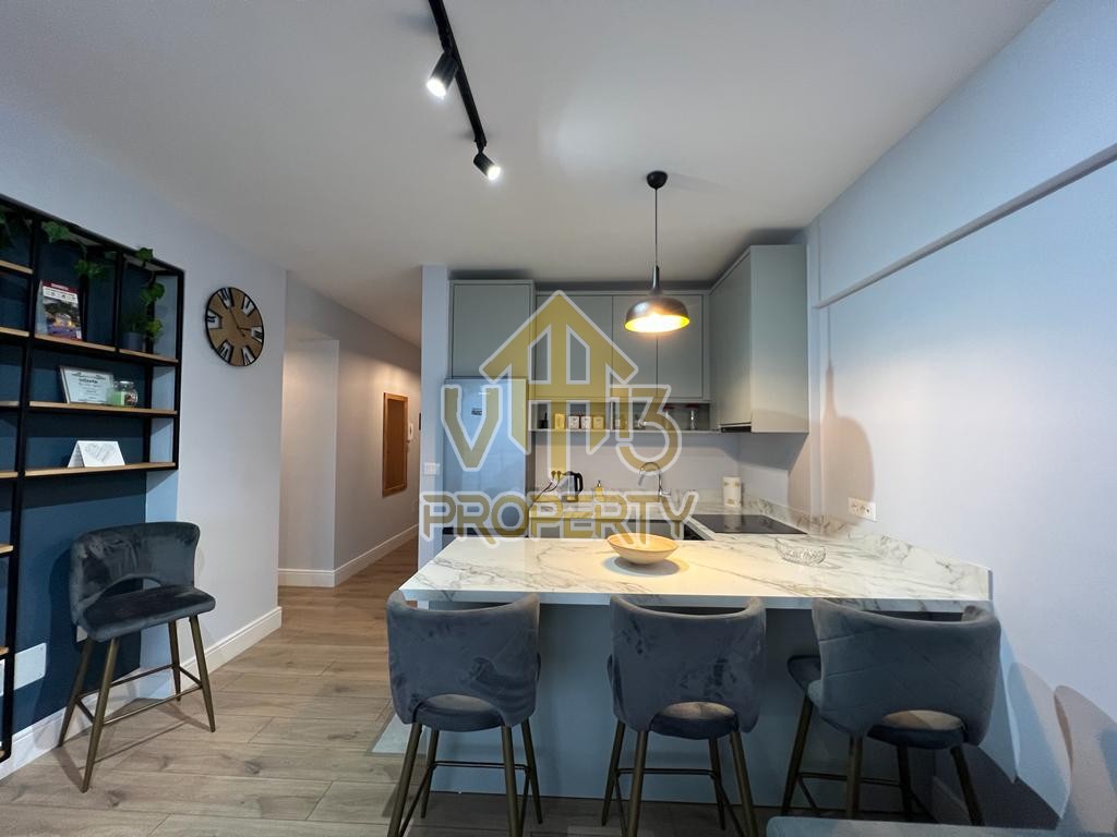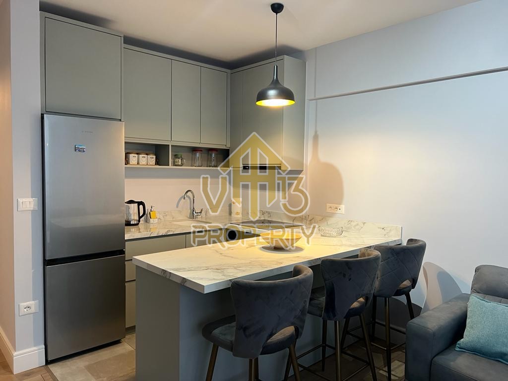 Apartamenti ndodhet ne nje nga zonat me relaksuese dhe te bukura te qytetit. Ka nje siperfaqe totale prej 100 m2 dhe siperfaqe e brendshme prej 90 m2. Eshte i organizuar ne nje koridor i cili ben shperndarjen ne dhomen e ndenjes se bashku me kendin e kuzhines, dy dhoma gjumi, nje tualet dhe nje ballkon me pamje ballore me detin. Apartamenti eshte i arreduar totalisht i nje stili modern deri ne detajet me te vogla. Zona ne te cilen ndodhet ofron akses ne te gjitha fasilitetet e nevojshme, ideale per nje jetese te qete dhe komode. Per nje vizite ne prone apo ne prona te ngjashme na kontaktoni.